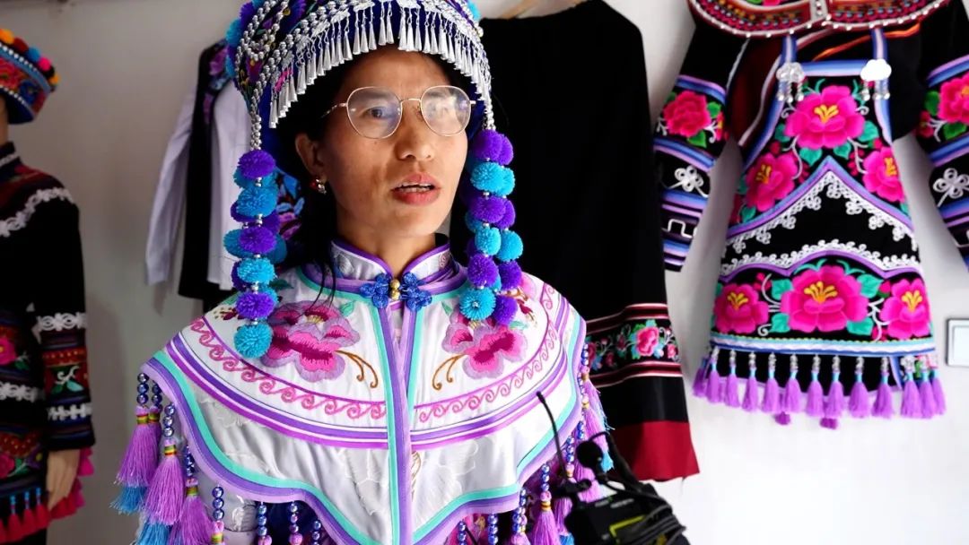 三台乡三台村委会石坎子小组村民李婷说:以前的服饰是比较传统式的,然后像现在我们做的服饰更现代化,现在的年轻人比较喜欢穿现代化的,然后改变了颜色,还有各方面款式都改变了很多,现在年轻人穿起来也比较时尚一点,比较简单,比较素。