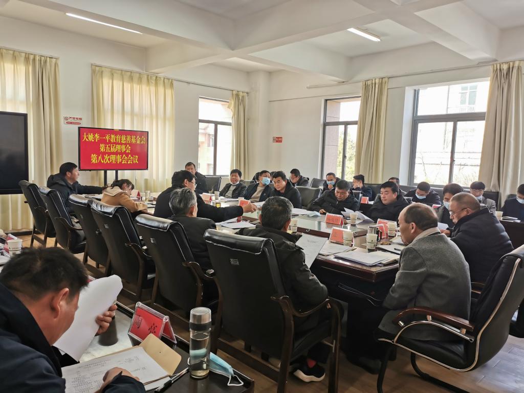 2022年2月25日下午,大姚李一平教育慈善基金会在大姚县人大常委会办公楼201室召开第五届理事会第八次理事会议。基金会第五届理事会理事长初怀雄、副理事长兼秘书长苏平、副理事长吴忠钦等理事出席会议;基金会监事会监事、教育体育系统主要负责人、基金会党支部成员、基金会秘书处办公室工作人员列席会议。会议由基金会第五届理事会理事长、党支部书记初怀雄同志主持。