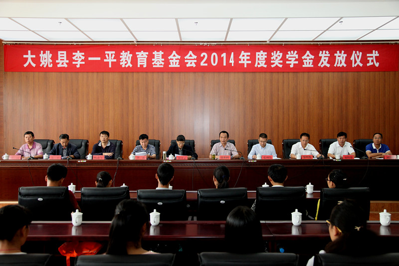 陆积峰(主席台右五)出席基金会2014年度奖学金发放仪式 |