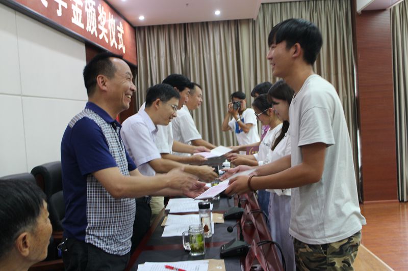 陆积峰(左一)2017年为受奖学生颁奖 |