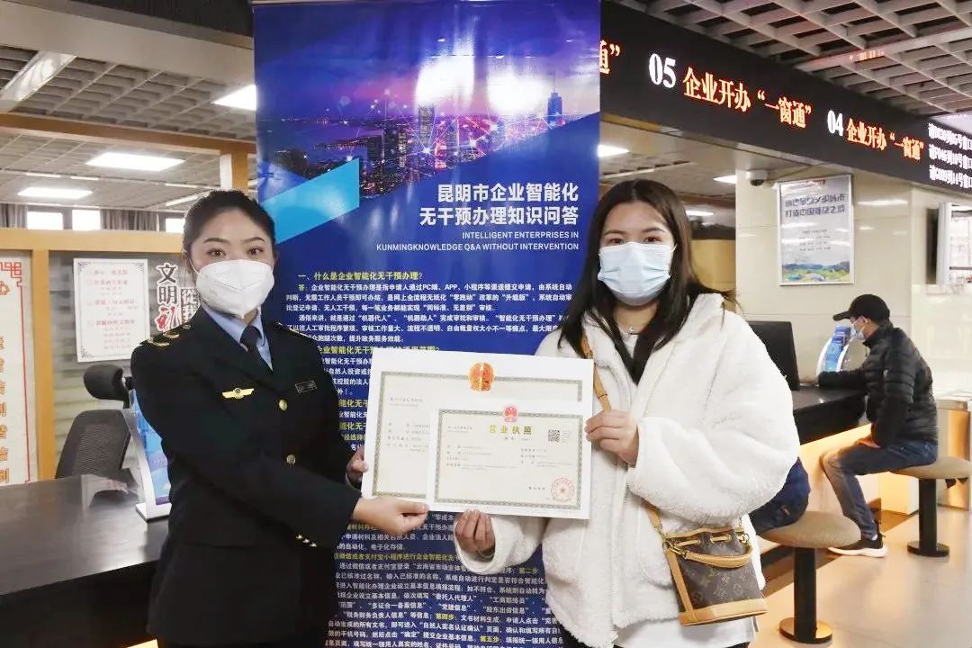 “秒批秒办,真正实现手机上也能开公司,太方便了。”2月15日上午,云南群廷商贸有限公司在昆明市官渡区市场监管工作人员指导下,通过“云南省市场主体智能化开办”小程序成功办理了云南省首张企业智能化无干预审批营业执照。