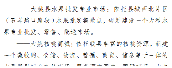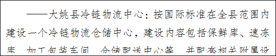 (七)现代商贸物流业。按照“物联网+”模式,高起点规划建设现代物流园区,在物流园区内配套建设大姚县冷链物流仓储中心,建立综合智慧物流配送体系,提升我县物流综合服务能力。