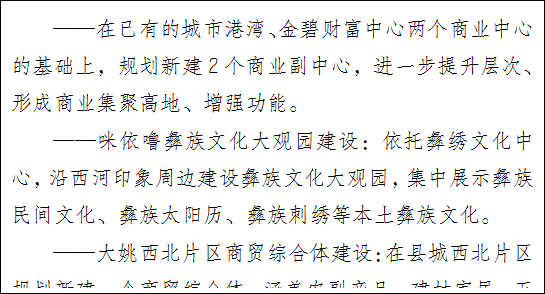 (三)在楚雄的发展战略中,大姚的区位优势将比历史任何时候都显得突出。州委、州政府作出加快两江(金沙江和元江)流域经济社会发展的部署,积极推动两姚(大姚和姚安)城镇组团发展。按照省委、省政府综合交通5年大会战的部署,州委、州政府提出“十四五”期间全面实现县县通高速公路、与周边区域全面实现高等级路互联互通目标,过境大姚的楚(雄)永(仁)、元(谋)宾(川)高速公路以及攀枝花经湾碧至金安的沿江(金沙江)高速公路有望启动建设,金沙江中游航运基础设施(湾碧码头)加快建设,制约大姚发展的交通瓶颈将会逐步缓解。大姚位于川滇结合部,昆瑞经济带滇中、滇西两个增长极的节点上,属于云南北大门(永仁)的辐射区,大姚与周边攀枝花、大理、丽江、楚雄等中等城市的融合互动必将强化,大姚的发展将迎来新的历史性机遇。