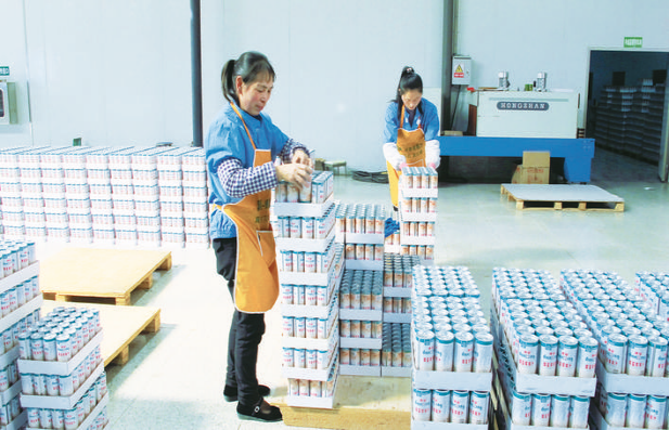图为大姚华盛饮料食品有限公司员工在进行核桃汁饮品装箱。