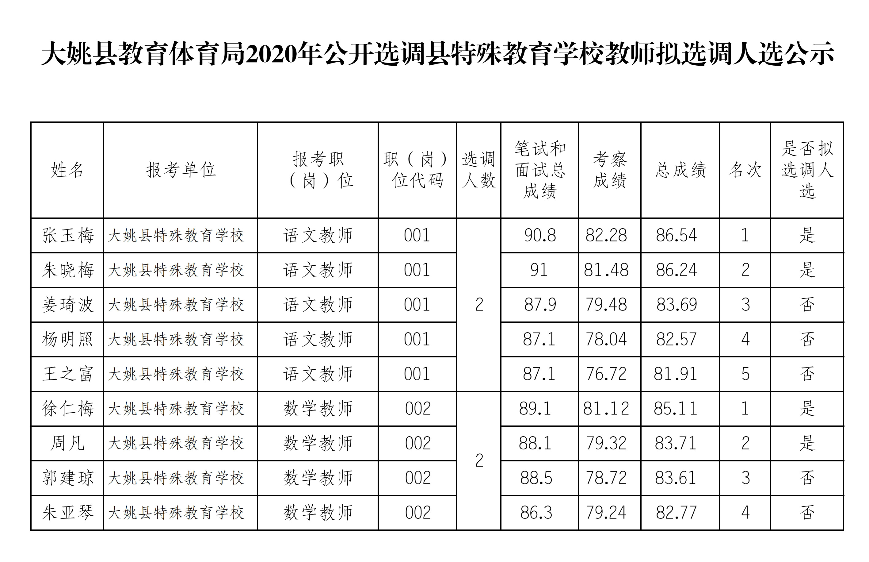 根据《大姚县教育体育局关于2020年选调县特殊教育学校教师公告》要求,大姚县教育体育局2020年公开选调县特殊教育学校教师经公开报名资格审查、征求意见、笔试、面试、考察等程序,现将拟选调人员名单予以公示。