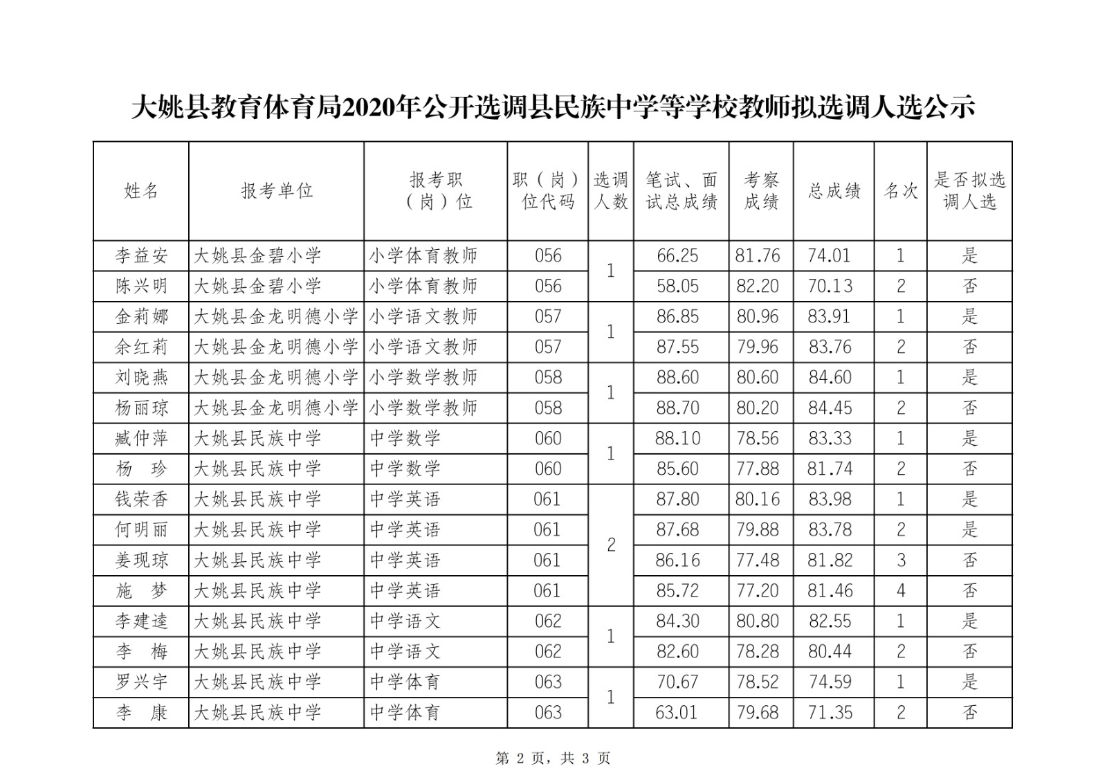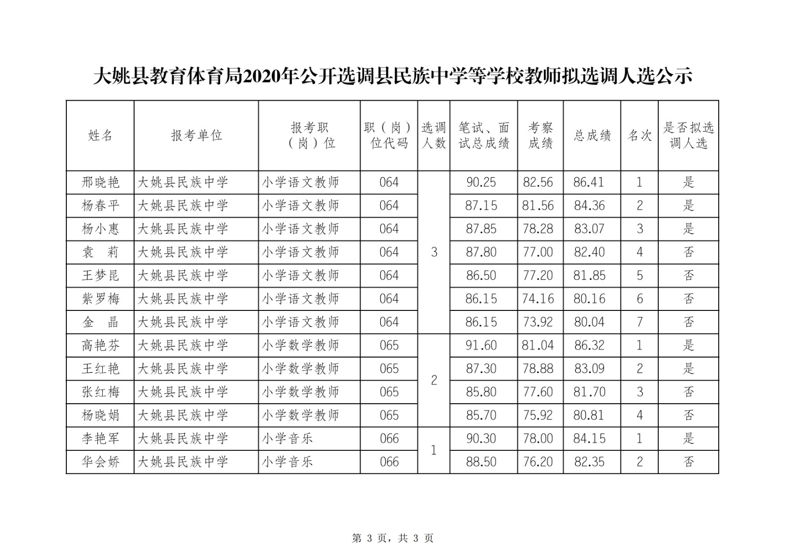 根据《大姚县2020年公开选调县级机关公务员和事业单位工作人员公告》《大姚县教育体育局关于做好2020年公开选调县民族中学等学校教师有关事项的公告》要求,大姚县教育体育局2020年公开选调县民族中学等学校教师经公开报名资格审查、征求意见、笔试、面试、考察等程序,现将拟选调人选予以公示。