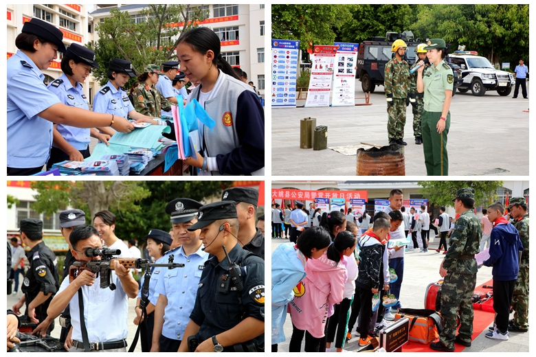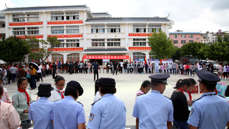当日,县公安局还举行了大姚县公安机关2018年警营开放日活动,县公安局政工、指挥中心、法制、国保、禁毒、治安、特警、交警、消防等部门的民警、特警队员、消防官兵分别向参加活动的县综治委成员单位领导、中小学校负责人、大姚一中初中部师生开展了道路交通安全手势、交通信号标识识别、精神病人防控、警用装备、枪械、消防器材展示、灭火器使用、暴恐事件防范处置等现场演示和演练。