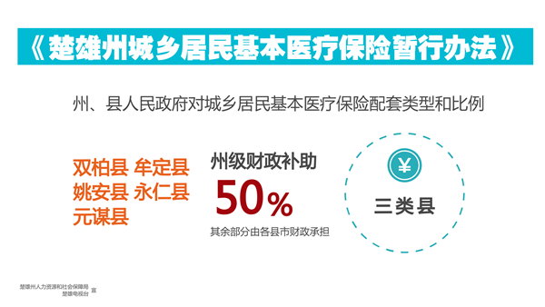 州、县人民政府对城乡居民基本医疗保险配套部分按县市类型和比例配套,一类县:楚雄市、禄丰县州级财政补助40%,二类县:南华县、大姚县、武定县州级财政补助45%,三类县:双柏县、牟定县、姚安县、永仁县、元谋县州级财政补助50%,其余部分由各县市财政承担。