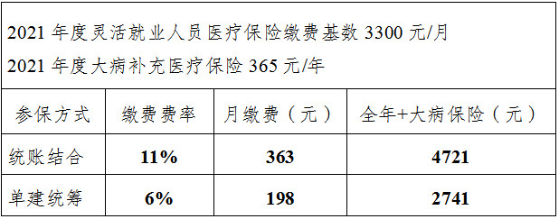 我县2021年度灵活就业人员医疗保险缴费分为统账结合(11%)和单建统筹(6%)两个缴费档次。