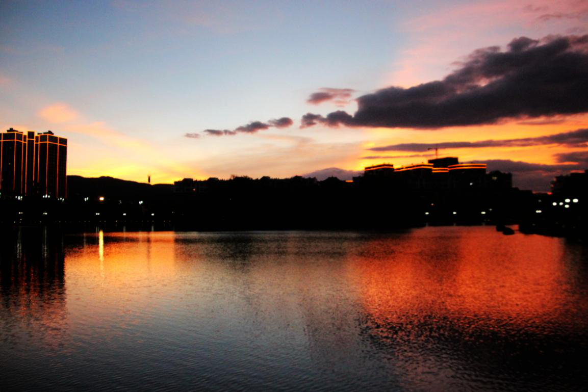 在色彩浓郁的晚霞照射下,蜻蛉湖的各个角落就像被镀上了一层柔和的滤镜。随着夕阳渐渐西下,蜻蛉湖满湖跃金,展现着柔美的线条,衬托出深沉而壮阔的意境,晚风掀起湖面点点波澜,粼粼波光渐欲迷人眼。水面上空,飞鸟唱晚,诗情画意,好一幅“落霞与孤鹜齐飞”的暮色图。我看过无数关于夏日的诗文,都不及这一刻唯美的落日黄昏。