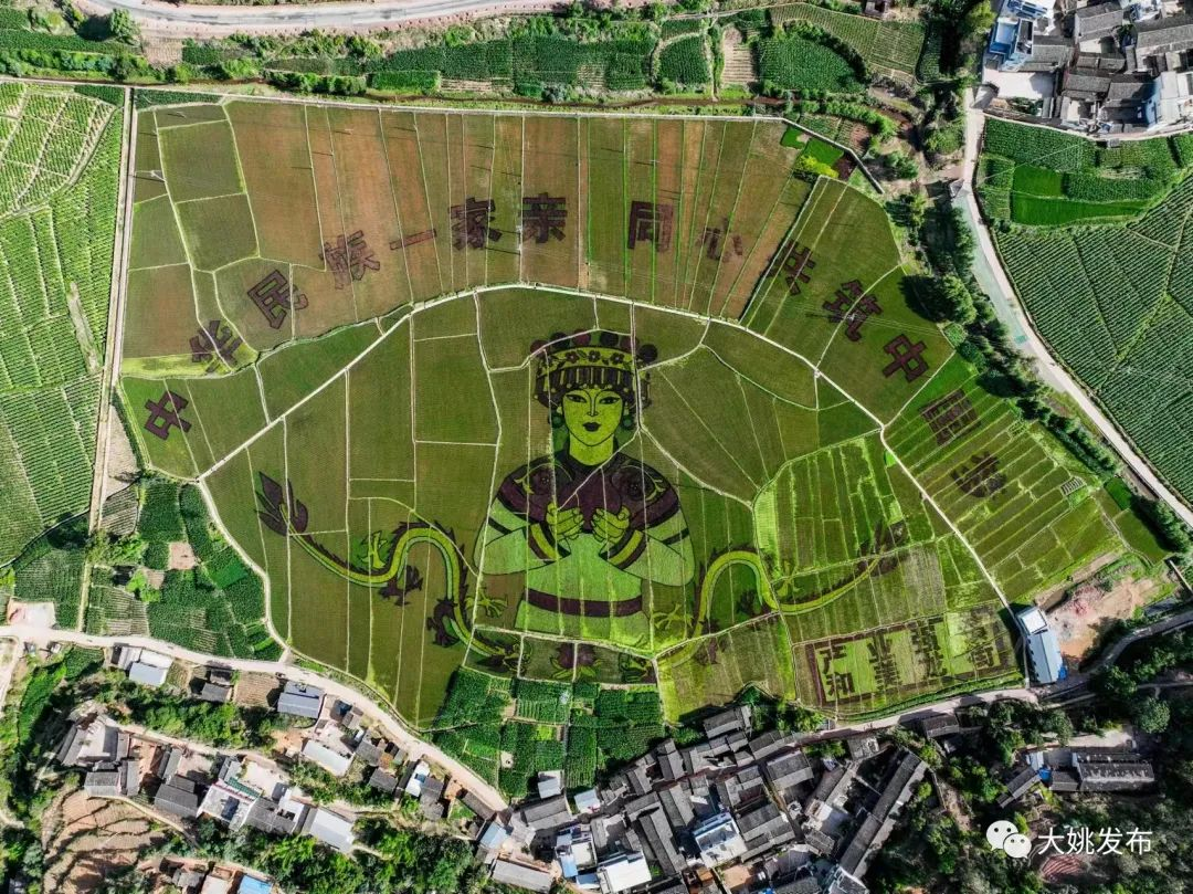 秋天到了,随着稻谷的成熟,不少田野里呈现一片片的金色浪涛。而在大姚县龙街镇五福村委会美泗村连片水稻田内,村民们用彩色水稻种出的以“中华民族一家亲 同心共筑中国梦”为主题的水稻字画清晰呈现。栩栩如生的“稻田画”,又一次成为龙街镇和美乡村的一道特色风景,引来大批游客纷纷登临观景台观赏拍摄这一金秋乡村美景。