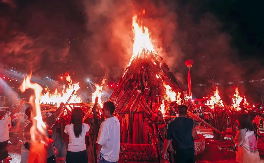 相传,很久很久以前,蜻蛉河两岸古树参天,绿水青山,像一颗绿宝石镶嵌在逶迤起伏的蜻蛉大地上。那里麂子出没、虎狼成群,彝汉人家以打猎和捕鱼为生,日子过得十分贫苦。在蜻蛉河的下游,有一瀑布,六十余丈高,常年水流不断、清澈见底,是仙家女子沐浴的好地方。一年农历六月二十五,两位仙女结伴下凡来沐浴,洗着洗着,眼看天色有变,准备返回,突然看见路上几个彝族青年猎人,他们用树叶和兽皮遮体,没衣服穿。那时彝族妇女更是衣不遮体,所以羞于出门。仙女们动了恻隐之心,唤来两匹坐骑,一匹金马和一只碧鸡,从金马身上拔了一根鬃毛,从碧鸡身上拔了一根羽毛,抛向天空。金马身上的长鬃毛变成了绣线,短鬃毛变成了绣花针,碧鸡的羽毛变成了绣布。天空中彩霞满天,金马和碧鸡慢慢腾空飞起,沿禺同山旋转几圈后,恋恋不舍地飞走。从此以后,金马碧鸡的故事流传在赵家店。禺同山上的彝族先民就用仙女给的绣花针、绣线和绣布做成了五彩斑斓的绣花服饰。赵家店三潭一带的彝族群众为了感谢仙女,就在每年的农历六月二十五举行篝火晚会,竖起火把,聚集在三潭瀑布山腰,身穿五彩斑斓的绣花衣,踏歌起舞,尽情欢乐,感谢仙女和金马碧鸡带给他们的美好生活。