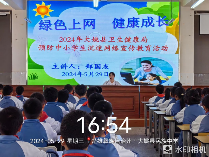 为引导广大未成年人形成健康文明的上网习惯,科学认识、正确对待、合理使用网络,有效预防未成年人沉迷网络游戏等不良行为,2024年5月29日下午,大姚县妇幼保健院联合大姚县民族中学开展了“预防未成年人沉迷网络宣传教育”讲座活动。