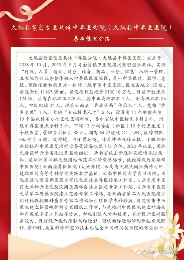 2023年11月23日,由楚雄市中医医院副主任药师张霞为组长的州级专家组一行3人到大姚县中彝医医院开展中药饮片质量管理现场检查。