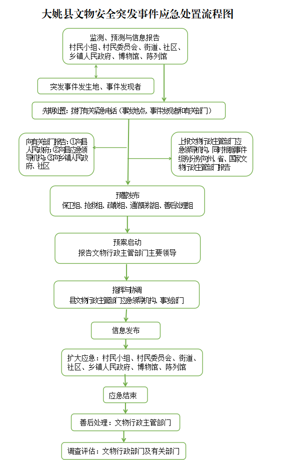 (1)Ⅰ级突发事件发生后,县文物行政主管部门启动本预案,指导应急处置工作。在参与应急处置的同时,将事件情况核实后及时上报县人民政府和州文物局、省文物局,国家文物局。