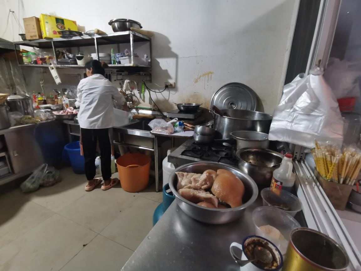 3.食品加工区环境卫生差、垃圾桶未带盖,地面、炊具油污重,清洁不到位,操作台杂乱。