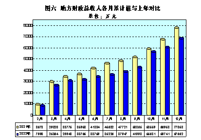 5.地方财政总收入累计实现67662万元,比上年同期下降12.2%。一般公共预算收入累计实现52345万元,比上年同期下降16.0%。一般公共预算本级支出完成238678万元,比上年同期下降9.8%。