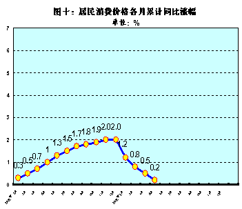 4.居民消费价格总水平累计比上年同期上涨0.2%,商品零售价格总水平累计比上年同期上涨1.1%。