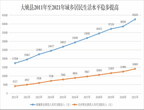 二、县域经济社会健康发展,人民生活基础设施进一步夯实党的十八大以来,中共大姚县委、大姚县人民政府团结带领全县各族人民,以习近平新时代中国特色社会主义思想为指引,坚定贯彻落实习近平总书记考察云南重要讲话精神,认真贯彻落实中央、省、州“稳增长、调结构、惠民生、防风险”各项决策部署,统筹推进政治、经济、文化、社会、生态文明建设,2011年至2020年十年间,地区生产总值从342077万元增长到1094738万元,增长3.2倍,年平均增速10.78%;固定资产投资从217417万元增长到981728万元,增长4.5倍,年平均增速22.9%;财政一般预算收入从22200万元增长到60369万元,增长2.7倍,年平均增速16%。
