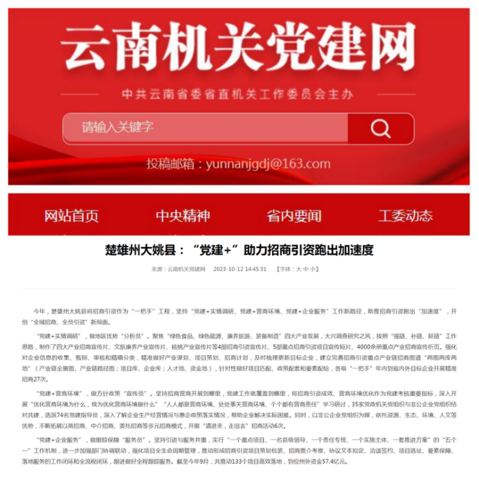 今年,楚雄州大姚县将招商引资作为“一把手”工程,坚持“党建+实情调研、党建+营商环境、党建+企业服务”工作新路径,助推招商引资跑出“加速度”,开创“全域招商、全员引资”新局面。