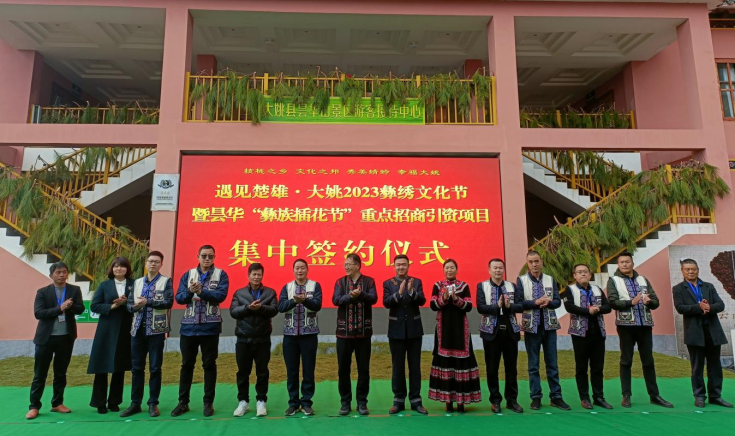 千里彝山春来早,又是一年马缨红。2023年2月27日,在遇见楚雄·大姚2023彝绣文化节暨昙华彝族插花节活动举办期间,大姚县通过形式多样、内容丰富的活动,充分凸显独特的民族文化魅力,并以节庆活动为契机,邀请全国各地40余家企业、商会、协会的70余名企业家代表齐聚大姚,举办招商引资洽谈推介会与重点招商引资项目集中签约仪式,现场签约10个项目。