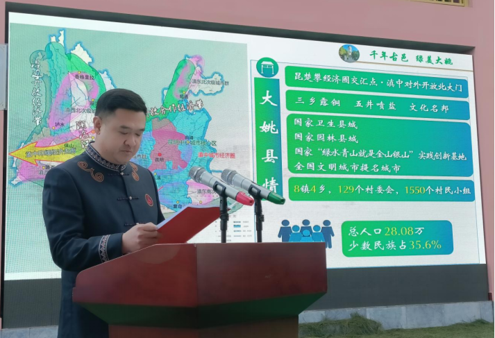 推介会以大姚文旅宣传片拉开序幕,中共大姚县委副书记、县人民政府县长杨军向大家介绍了大姚的历史文化、交通区位、自然资源、发展前景、投资环境,推介了绿色食品、绿色能源、康养旅游、装备制造四大产业,重点推介了3万吨优质薄壳核桃精深加工及科技孵化产业园、核桃康养小镇开发、七街红色文旅小镇、昙华民族特色旅游康养村开发运营、新能源电池产业园5个招商项目。