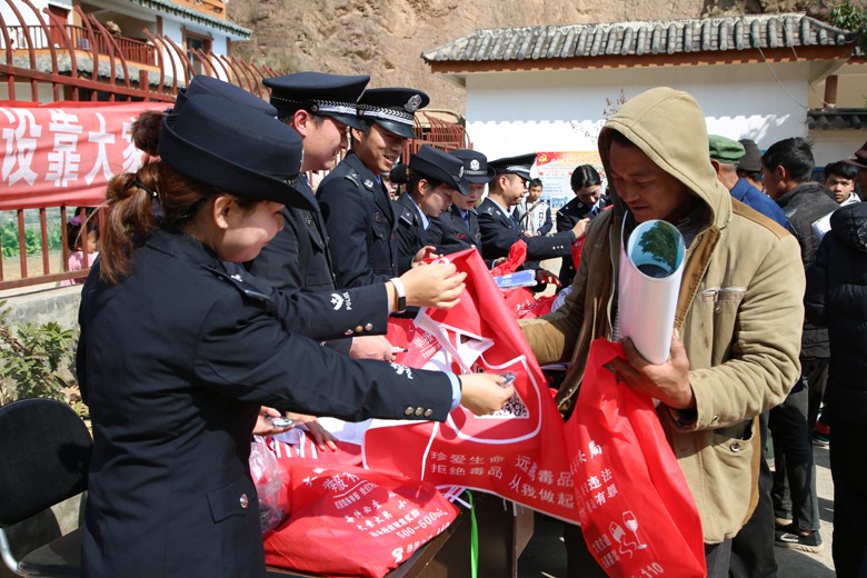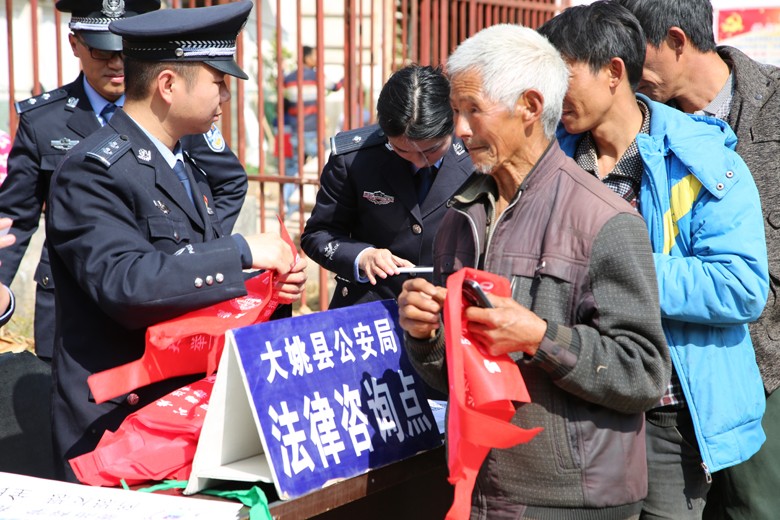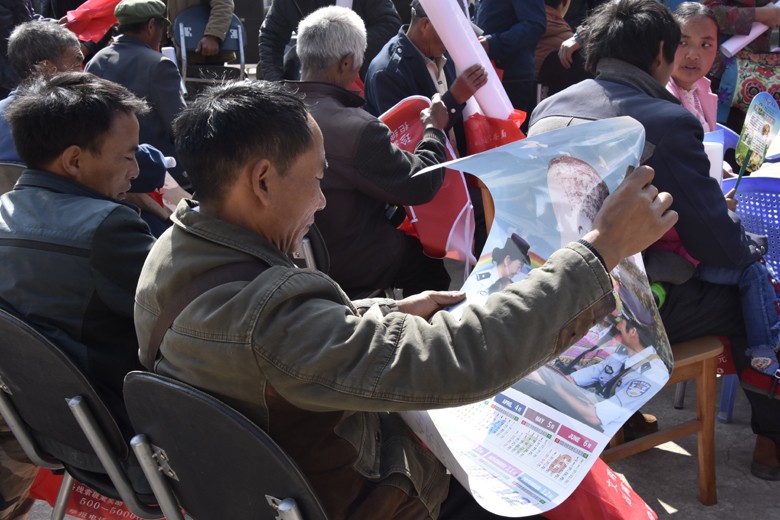 文艺演出结束后,小分队还在演出现场开展了法律咨询,送法下乡活动,为2个村委会的群众提供法律咨询服务。同时,将县公安局精心制作的2018年警察挂历、有奖举报环保袋、围裙、打火机等贴近百姓生产生活的科技致富宣传资料发到群众手中,让彝家山寨的贫困群众在田间地头,自家门口就能享受到丰富的文化大餐。