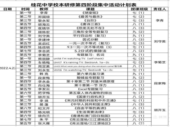 为进一步推动桂花镇中小学课堂教学改革,增进教师业务水平与教学能力的提高,增强中青年教师队伍建设,提高中青年教师整体素养,为桂花镇中青年教师搭建一个展现自我,锻炼自我,交流学习、彼此提高的舞台,2022年4月21日至22日,大姚县桂花镇中心学校开展了2022年校本研修第四阶段研修活动。