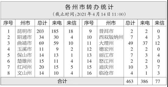 截至4月14日上午11:00,督察组交办群众举报投诉生态环境问题共八批463件(来电386件、来信77件),昆明市203件,曲靖市69件,大理州49件,昭通市34件,红河州20件,楚雄州15件,文山州14件,保山市14件,玉溪市11件,迪庆州10件,西双版纳州7件,丽江市7件,临沧市4件,怒江州2件,普洱市2件,德宏州2件。