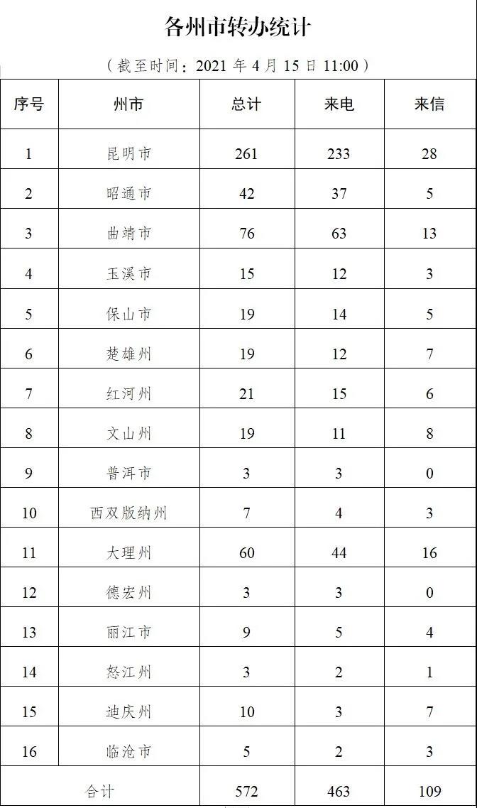 截至4月15日上午11:00,督察组交办群众举报投诉生态环境问题共九批572件(来电463件、来信109件),昆明市261件,曲靖市76件,大理州60件,昭通市42件,红河州21件,楚雄州19件,文山州19件,保山市19件,玉溪市15件,迪庆州10件,丽江市9件,西双版纳州7件,临沧市5件,怒江州3件,普洱市3件、德宏州3件。
