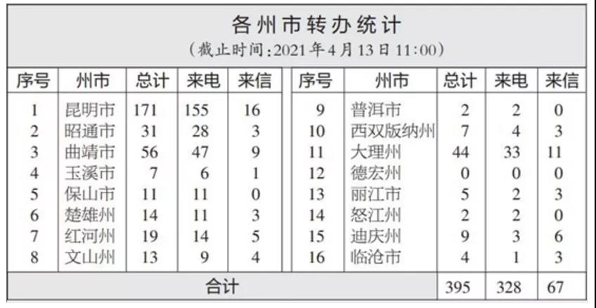截至4月13日上午11:00,督察组交办群众举报投诉生态环境问题共七批395件(来电328件、来信67件),昆明市171件,曲靖市56件,大理州44件,昭通市31件,红河州19件,楚雄州14件,文山州13件,保山市11件,迪庆州9件,玉溪市7件,西双版纳州7件,丽江市5件,临沧市4件,怒江州2件,普洱市2件。