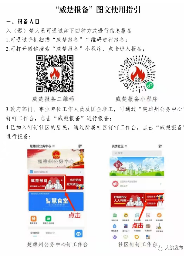 二、入县提前报备。主动劝导有疫情风险地区旅居史或与公布的确诊病例、无症状感染者可能存在的密切接触人员的家人、亲友等暂缓入县。所有来返县人员须提前24小时通过“威楚报备”小程序或电话方式向目的地乡镇、单位、社区(村)报备。