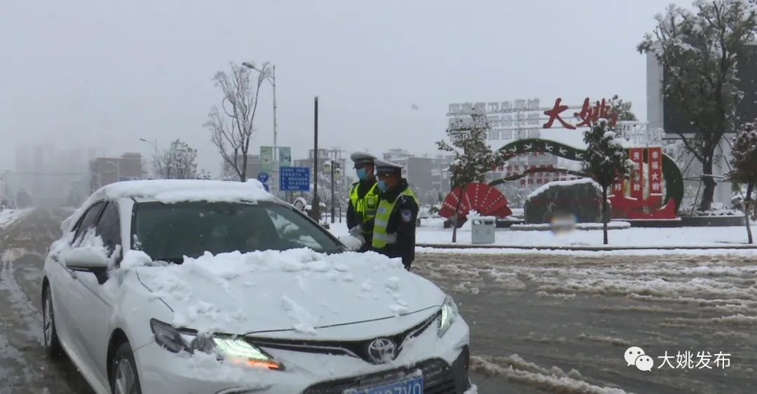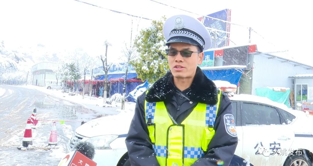 大姚县交警大队大队长王庭康说:“针对昨天和今天出现的降雪极端天气,我们立即采取了一些紧急措施,首先是向全县收集道路情况,向社会发布路况信息,提醒广大交通参与者注意出行安全,非必要不出行,另外我们交警大队的全体民警、辅警上路排查道路隐患,同时对不具备通行条件的道路实行管控,劝返一些驾驶员非必要不出行。”
