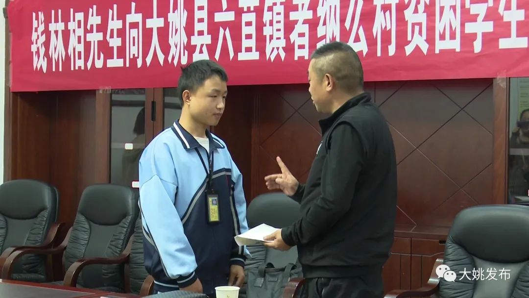 起晓楠家住六苴镇者纳么村瓦二小组,是大姚一中的高一学生。2019年,起晓楠的父亲突发脑淤血早逝,今年8月,噩耗再次传来,母亲也因病去世。家中一下子只剩下姐弟二人相依为命,而且家中建房贷款尚未还清,生活十分困难。者纳么驻村工作队在巩固脱贫攻坚推进乡村振兴及定点帮扶工作中,了解到起晓楠的家庭情况后,第一时间与村委会研究,及时为他申报孤儿资格,保障了他的基本生活。9月16号,州发改委到者纳么村入户走访,得知起晓楠的情况后,十分关心,千方百计帮助联系爱心人士。云南森阳有限责任公司负责人钱林相挺身而出,为起晓楠捐赠助学金20000元,帮助他渡过难关。