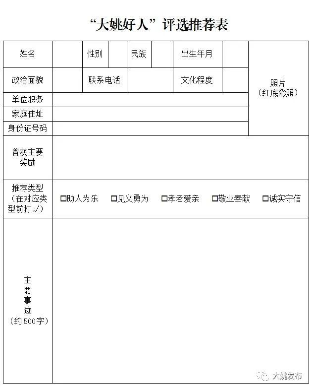为深入实施公民道德建设工程,进一步培育和践行社会主义核心价值观,深入推进社会公德、职业道德、家庭美德和个人品德建设,发挥身边好人先进典型的示范引领作用,营造推荐好人、崇尚好人、学习好人、争当好人的浓厚氛围,县文明委决定开展2023年度“大姚好人”评选活动,在全县各行业各领域中寻找好人,在日常生活中发现好事。为配合活动开展,公开接受广大市民推荐评议。