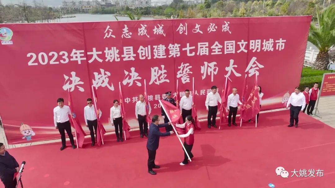 会上,王丽平向10家创建工作重点单位颁授“创建全国文明城市决战决胜旗”。参会人员进行了“共创全国文明城市、共享幸福大姚荣光”集体签名。