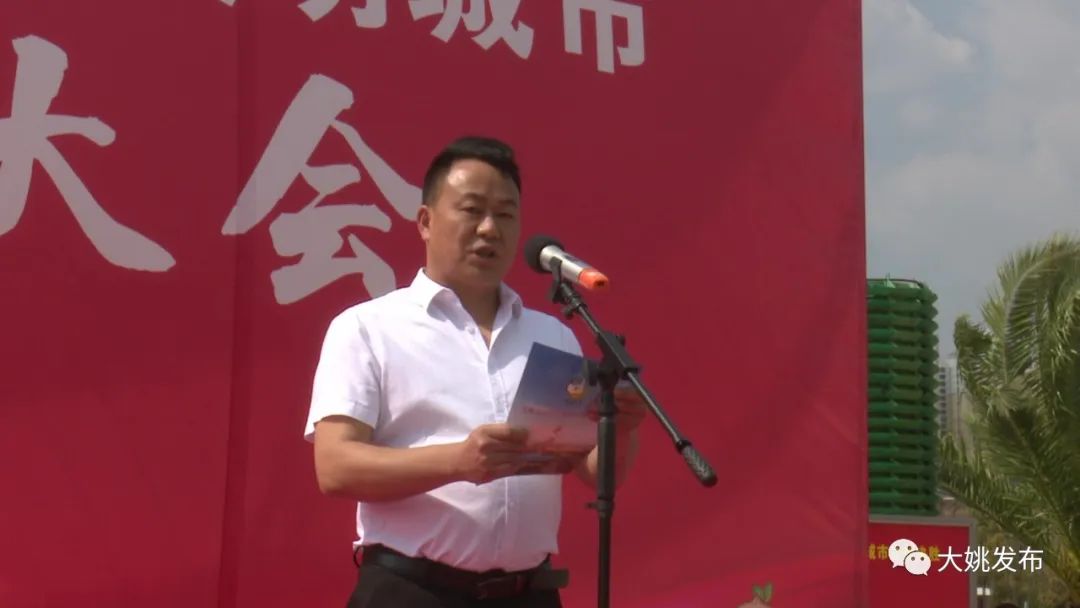学生代表 夭怡说:同住一座城,共爱一个家!从现在做起,从身边做起,从小事做起!讲文明,树新风,当示范,作表率,争当文明小市民!小手拉大手,文明齐步走,为大姚创建全国文明城市贡献力量!