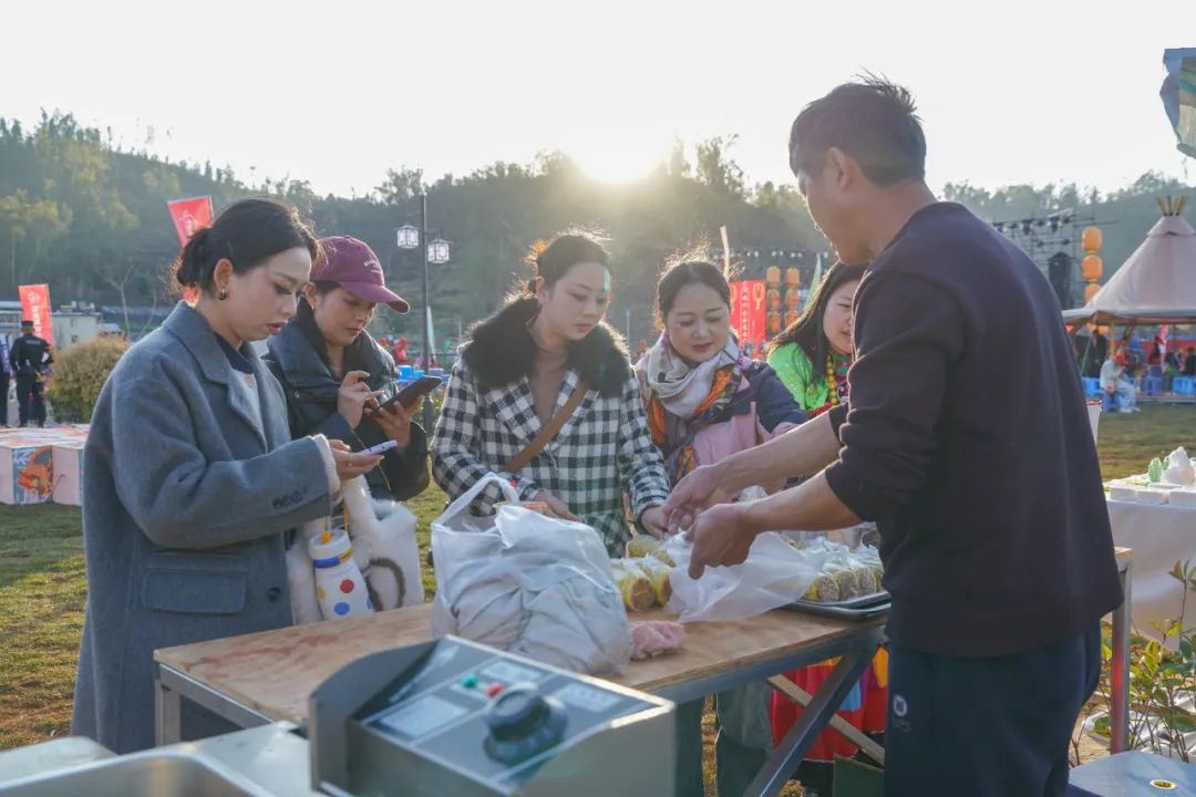 写春联、彝族刺绣、花灯提游等年味十足的民俗活动特别引人驻足。各类美食摊位上,铁皮卡咖啡、野坝子蜂蜜、小土饼、菜盒子等地方特色食品散发着诱人的香气,吸引了众多群众驻足品尝。整个市场人流如潮,喜庆的氛围让每个人的脸庞都洋溢着幸福的笑容,仿佛是播撒在这片土地上的希望与快乐。