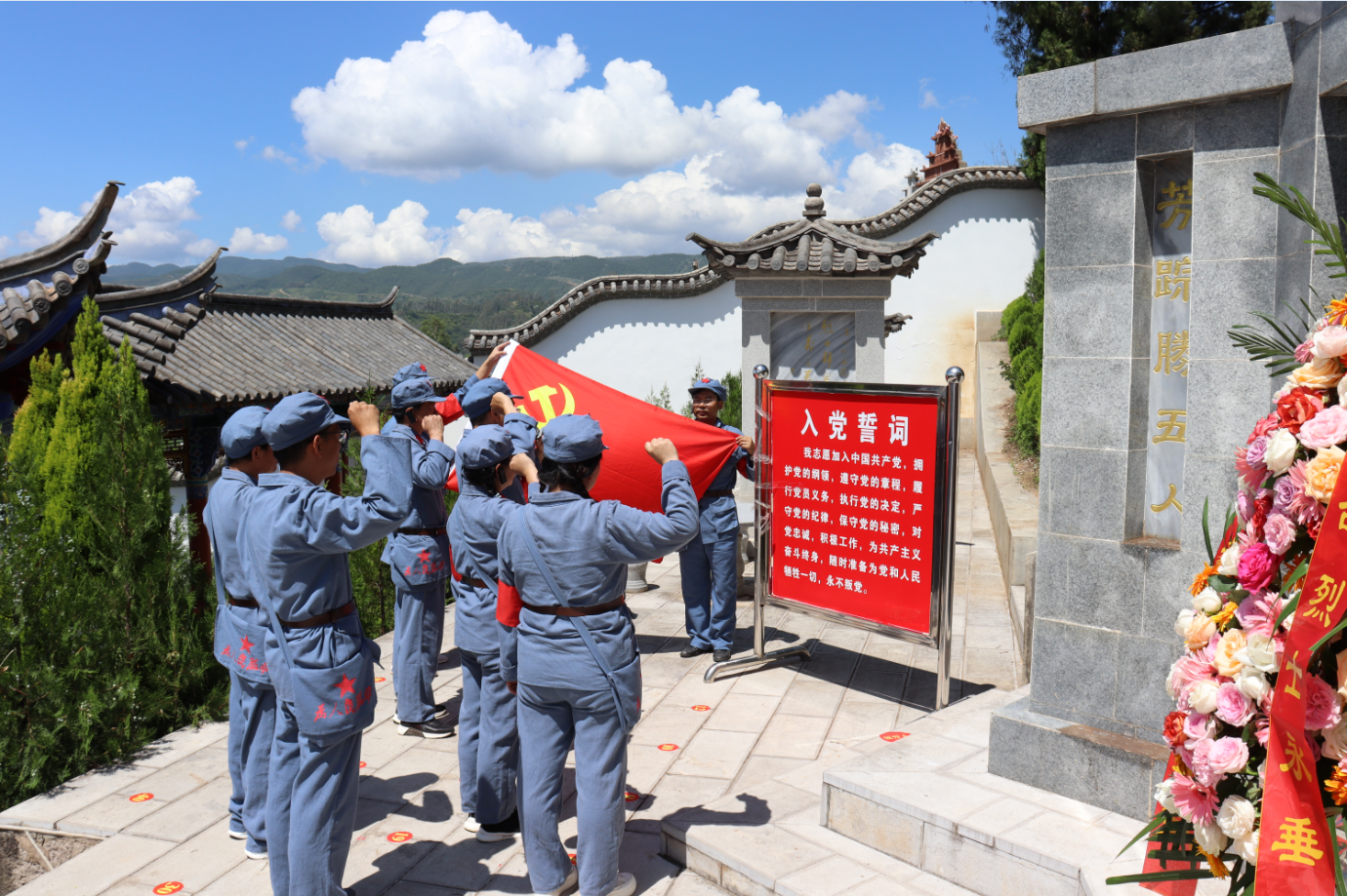 在赵祚传烈士陵园,大家祭扫英烈、敬献鲜花,深切缅怀革命先烈。在革命先烈革命精神的感召下,全体党员面向党旗,举起右拳,一字一句重温入党誓词,重忆入党初心和使命,进一步增强为共产主义事业奋斗终身的信心和决心。