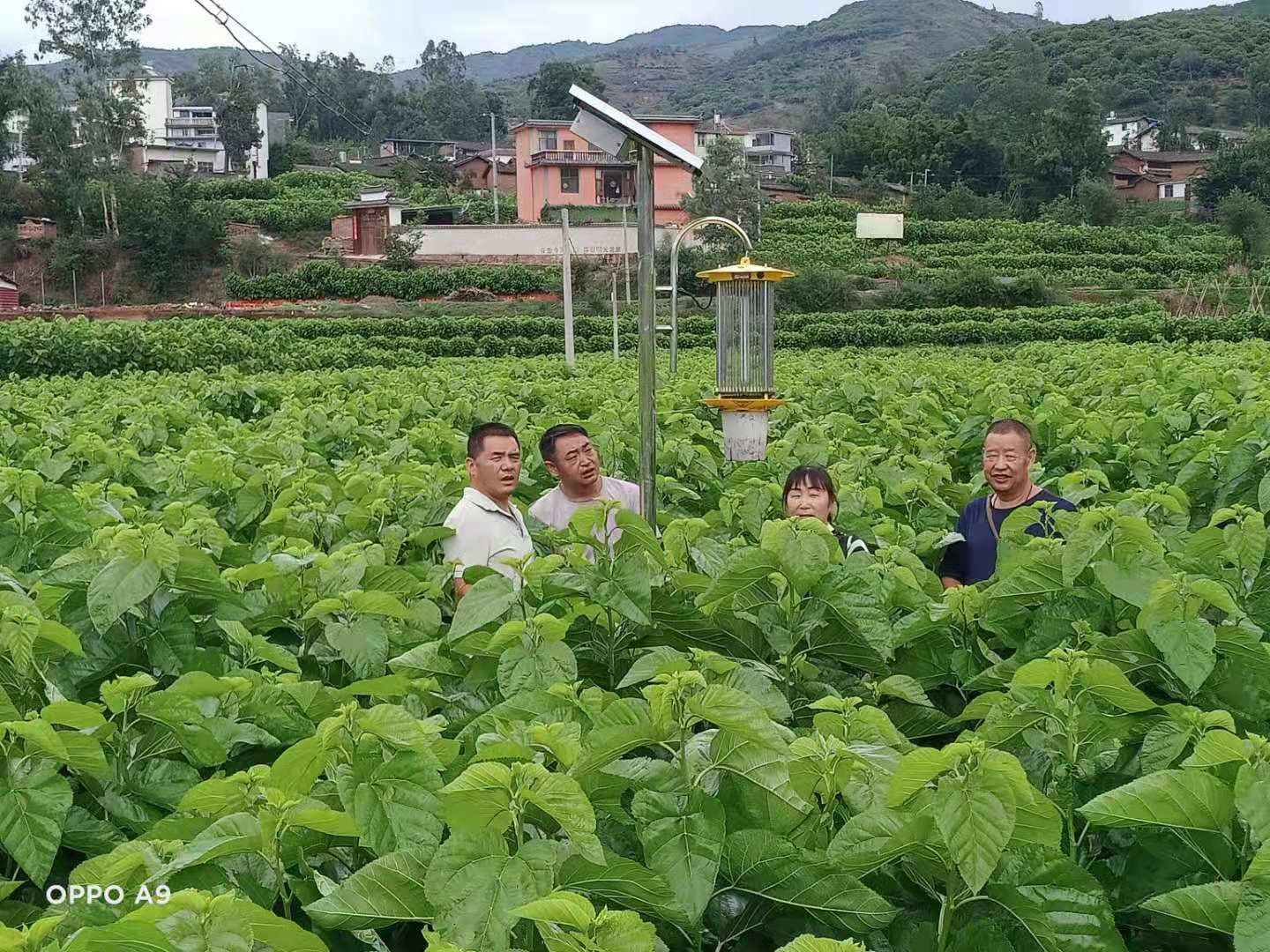 督导组一行先后到金碧镇凉桥、石羊镇大中、柳树塘、黎武4个绿色防控示范基地,实地查看桑园管理、了解智能杀虫灯工作情况。柳树塘蚕农杨文武和凉桥村委会邹兰妹回答如出一辙:安着杀虫灯好尼,打药蚕容易中毒,这久小蛾子(蛾类)、老黄虫(金龟子)、长角虫(天牛)三四天就有半桶(集虫瓶)多了,天亮早早来倒了埋着、、、、、。看着桑园一片碧绿,桑叶青翠欲滴,听着蚕农对绿防效果的认可,州产业中心一行对大姚县项目工作给予了充分肯定。目前夏蚕已进入大蚕期,要求结合各乡镇、村委会开展党史学习教育、万名党员进党校、为民办实事等契机,强化蚕桑科技培训和入户指导工作,根据气候物象继续做好蚕病防控预警工作宣传,确保夏蚕丰产丰收。