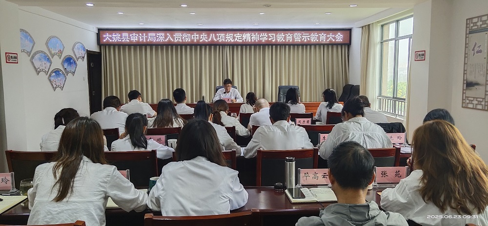 近日,大姚县审计局召开深入贯彻中央八项规定精神学习教育警示教育大会,持续深入学习习近平总书记关于加强党的作风建设的重要论述,围绕党中央和省、州、县通报的违反中央八项规定及其实施细则精神典型案例深刻开展剖析对照检查,并结合廉政党课和到县新时代廉洁文化中心、县党内法规教育基地开展现场警示教育,坚持以案为鉴、以案促改、举一反三,推动深入贯彻中央八项规定精神学习教育走深走实。