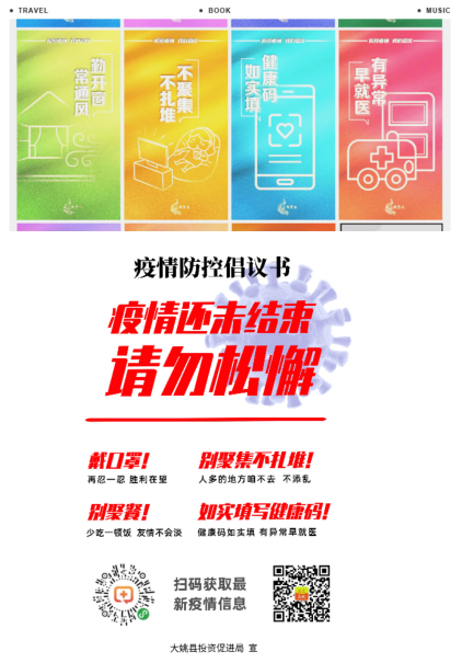 开展疫情防控志愿服务活动。县投资促进局结合部门工作及时制作疫情防控倡议书,于2021年2月5日组织干部职工到县城永胜农贸市场、超市门口、新车站、街道(社区)及网格化责任区等人员密集场所发放疫情防控倡议书,认真发挥好志愿者在联防联控工作中的重要作用,宣传疫情防控知识和健康生活方式,引导群众加强自我防护,使志愿服务始终成为常态化防控措施的重要组成部分。