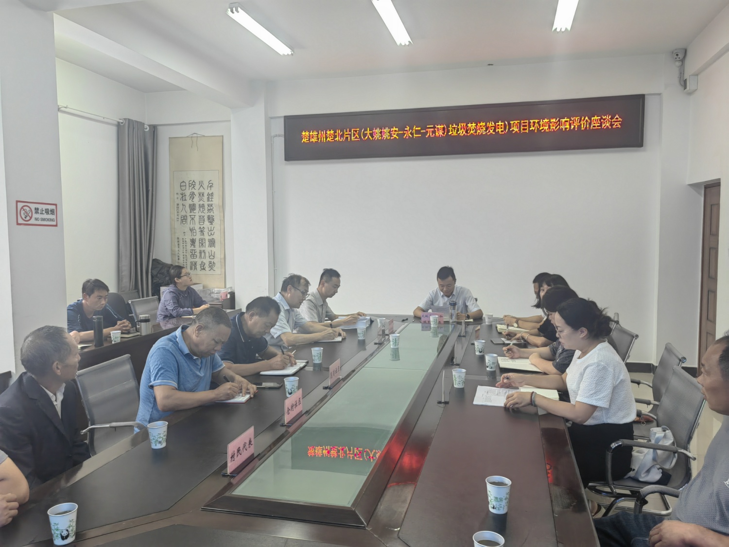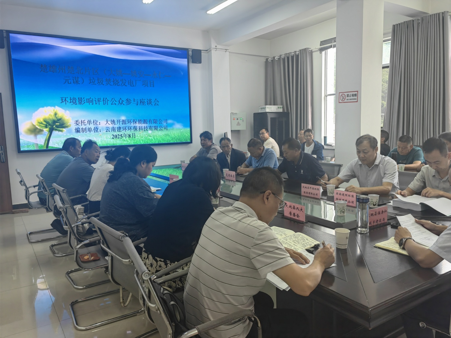 2025年8月8日,大姚县燃气管道等老化更新改造项目及楚北片区生活垃圾焚烧发电厂建设项目工作专班主持召开楚雄州楚北片区(大姚—姚安—永仁—元谋)垃圾焚烧发电厂项目环境影响公众参与座谈会,参加会议的有县人大、县政协、县发展改革局、县住房城乡建设局、州生态环境局大姚分局、金碧镇、范湾社区、仓街社区及梁上、大姜屯、邓家冲、李家冲、麻地冲小组村民代表和建设单位、环评单位代表共计20人。