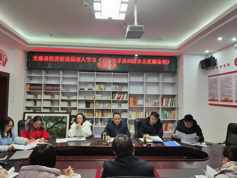 为进一步规范和促进矛盾纠纷化解工作,2022年1月17日,大姚县投资促进局组织干部职工认真学习传达《云南省矛盾纠纷多元化解条例》。