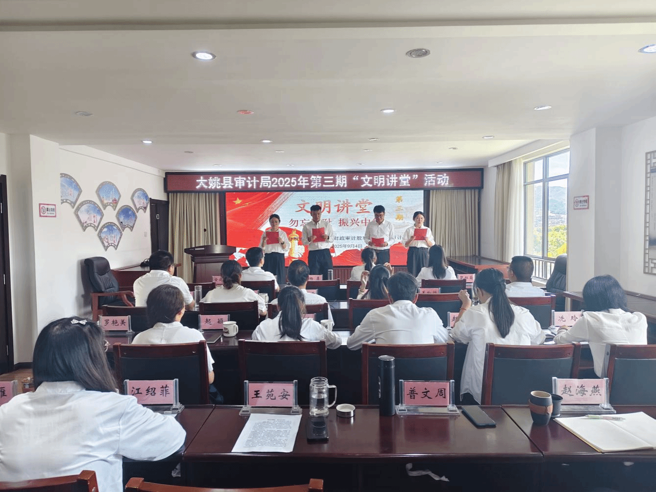 为深入弘扬爱国主义精神,增强审计干部的历史责任感和使命感,近日,大姚县审计局成功举办了2025年第三期文明讲堂活动。本次活动以“勿忘国耻,振兴中华”为主题,全体审计干部参与其中,共同接受了一次深刻的精神洗礼。