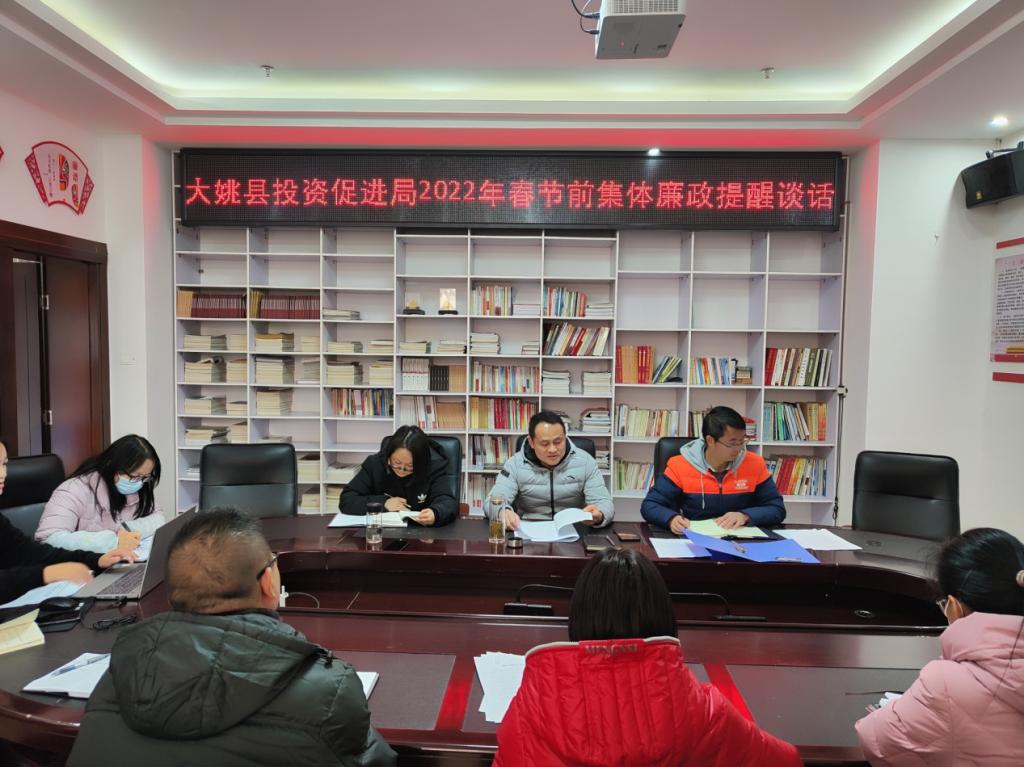 为切实履行全面从严治党主体责任,认真贯彻落实县委、县人民政府近期工作部署安排。1月28日下午,县投资促进局组织召开2022年春节纪律作风建设暨廉政提醒谈话会议,会议由局党组书记、局长普文平主持。