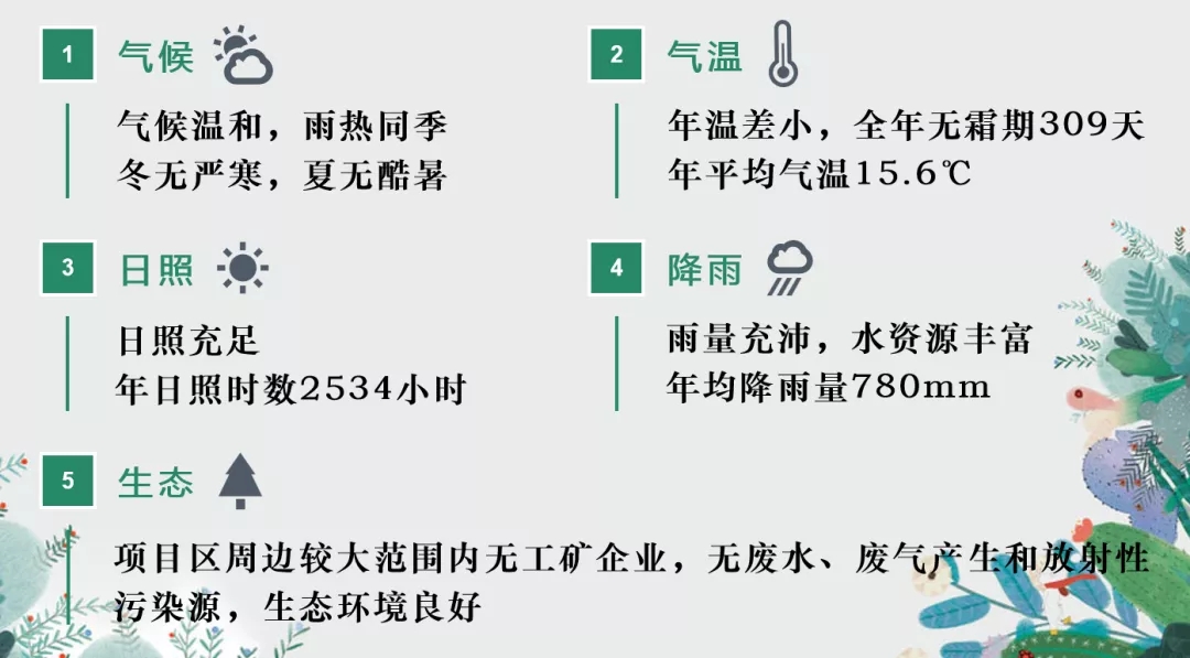 2.自然条件:项目区土壤肥力条件良好,海拔1600—2500米,属亚热带干燥气候,具有气候温和,日照充足,干湿季明显,雨热同季,冬无严寒,夏无酷暑,年温差小,年平均气温15.6℃,绝对最高气温33℃,最低气温-5.5℃,全年无霜期309天。年日照时数2534小时,年均降雨量780mm,雨量充沛,水资源丰富。耕地土壤属水稻土和紫色土,有机质含量高。项目区周边较大范围内无工矿企业,无废水、废气产生和放射性污染源,生态环境良好,被农业环境监测部门认证为无公害生产基地。