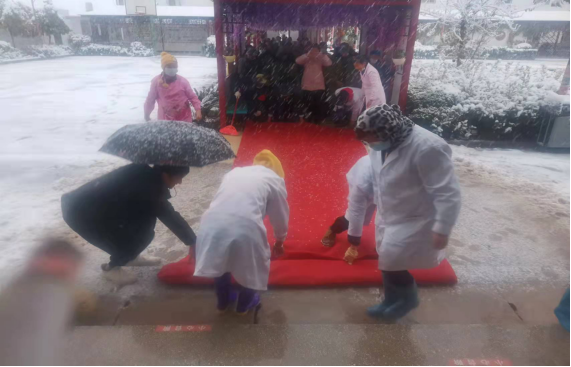 一大早,鹅毛般的大雪一直下个不停,厚厚的积雪阻断了从中心敬老院休闲长廊至老人餐厅10多米长的通道,为保障老人安全,防止老人在就餐途中摔倒,工作人员冒着极寒天气铲雪铺上红地毯,为在院老人一日三餐保驾护航。90多岁高龄的爷爷曾凤德热泪盈眶地对工作人员说:“你们比我的亲人还要亲,我们在这里生活实在是太好了!”