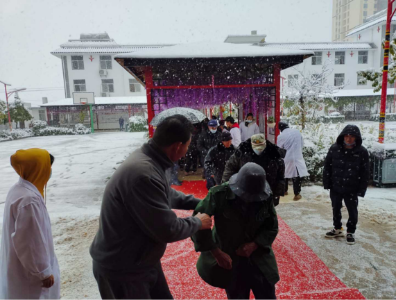 2022年2月22日,一场突如其来的大雪让大姚县中心敬老院的地面上堆积了约10余厘米厚的积雪,厚厚的雪地上被铲出了一条通道,铺上了一条格外耀眼的红地毯,红地毯从住宿区的长廊尽头一直铺到食堂,工作人员正冒着大雪,有序组织155名老人到餐厅午餐,20多名工作人员扶着老人们走上红地毯成了大雪中别具一格的靓丽风景线。