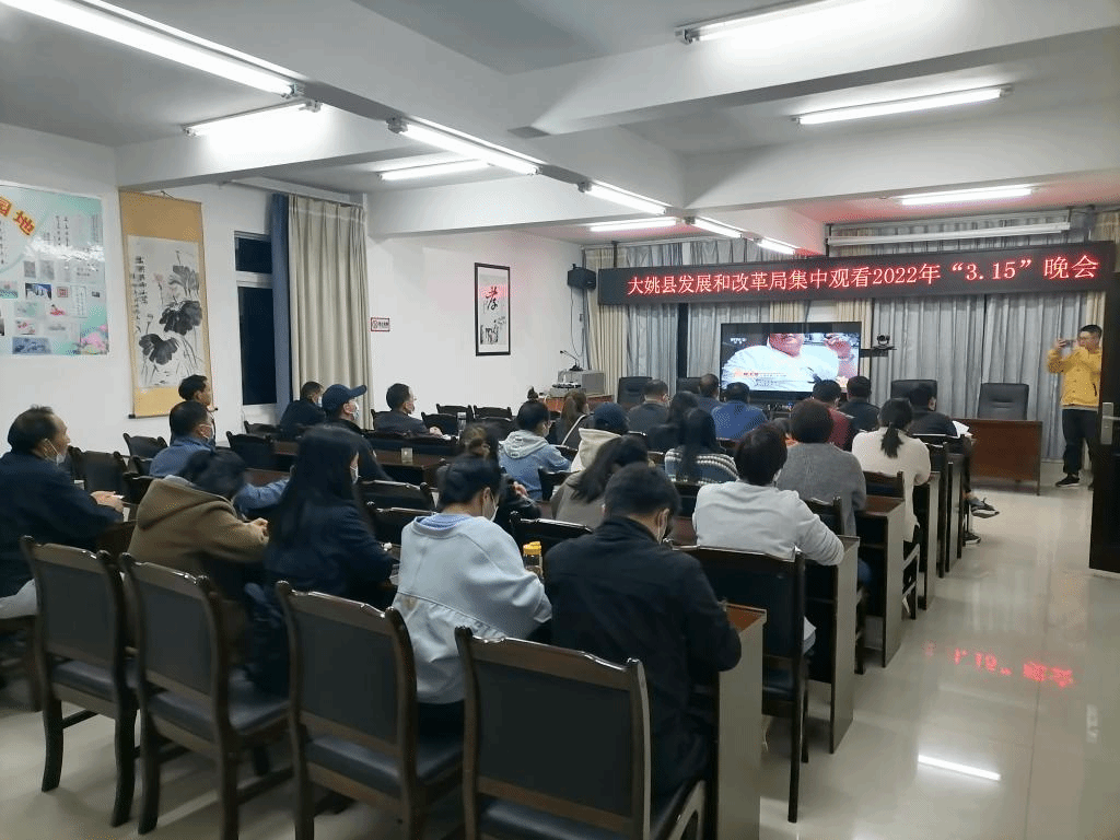 2022年3月15日晚,大姚县发展和改革局组织全体干部职工在会议室集中观看2022年主题为“公平守正 安心消费”的3·15晚会。